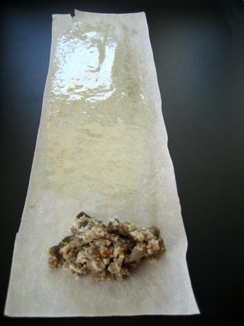 Βάζουμε σε κάθε λωρίδα μια κουταλιά γέμιση, λαδώνουμε καλά το φύλλο, διπλώνουμε τις δύο άκρες και τυλίγουμε (βλ. φωτο). Λαδώνουμε το κάθε ρολάκι απο πάνω και αν θέλουμε πασπαλίζουμε με λίγο σουσάμι.