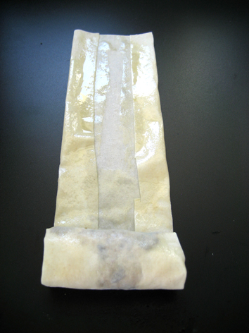 - Cut each fillo sheet into three rectangular pieces. Mine were roughly 12×33 cm. In Greece we also have thick ‘country style’ fillo which comes in 6-8 sheets. If you cannot find this in your country use the regular type, but roll together two pieces instead of one, otherwise your roll will be to weak to hold the filling.