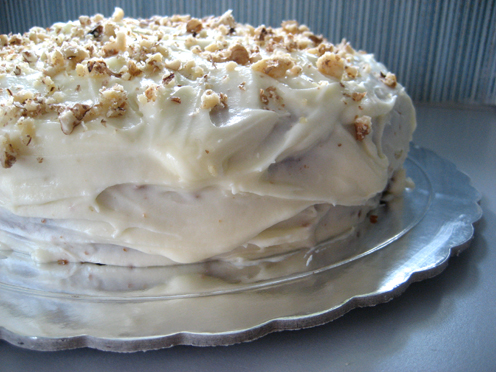 I wish you could taste this cake. I actually wish I could have sliced for you to see, but it was a present, so it had to remain intact. Fragrant olive oil and cinnamon, exotic molasses sugar, juicy carrots and crunchy walnuts, all combine into a moist cake, which is almost good for you! If you are watching your calories, omit the frosting, although everyone said that they would have wanted more of it.