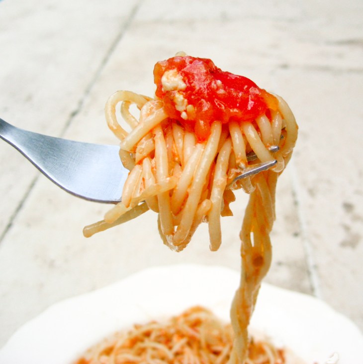 My version of the pasta alla Norma contains courgettes alongside the aubergines and it is topped with Greek manouri cheese, a strong and buttery goat and sheep’s cheese from central and northern Greece. Most importantly, however, I made it from leftover vegetable pulp from the gemista I posted last week. The Leftover Queen would be proud.