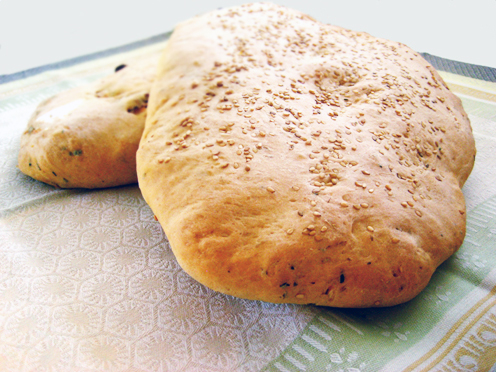 7. Brush each bread with water and sprinkle ample sesame seeds. Bake for a total of 40-50 minutes. Times vary depending on the oven and shape of bread. Individual breads might need less time, usually 35-40 minutes. Remove bread from oven and let it cool on a rack.