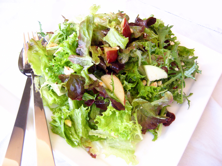 - Arrange the greens on a large platter, mix in apples and hazelnut drizzle with the dressing and serve.