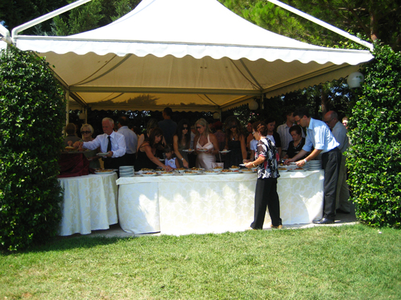 Μετά το γάμο ένα πουλμανάκι μας μετέφερε στο μέρος που θα γινόταν η δεξίωση, ένα καλοφτιαγμένο ρουστίκ «αγρόκτημα» με έναν πανέμορφο κήπο και θέα μέχρι τη θάλασσα. Το πρώτο γαστριμαργικό σοκ προήλθε από τον μπουφέ με τα πρώτα, μήκους περίπου ενός χιλιομέτρου, ο οποίος μην φαντάζεστε ότι είχε σαλατούλες και τυράκια. Ατελείωτα πιάτα θαλασσινών, από γεμιστά καλμάρια, καπιστά χέλια και φρέσκα στρείδια, μέχρι ολόκληρα ψάρια ψημένα σε κρούστα αλατιού, μπούτια παλαιωμένου προσούτο που κοβότανε από ειδικό, χοιρινό σούβλας και άλλα τινά. Καταλαβαίνετε πως έπερεπε λίγο να συγκρατηθούμε γιατί μετά ακολουθούσε μενού τριών πιάτων!