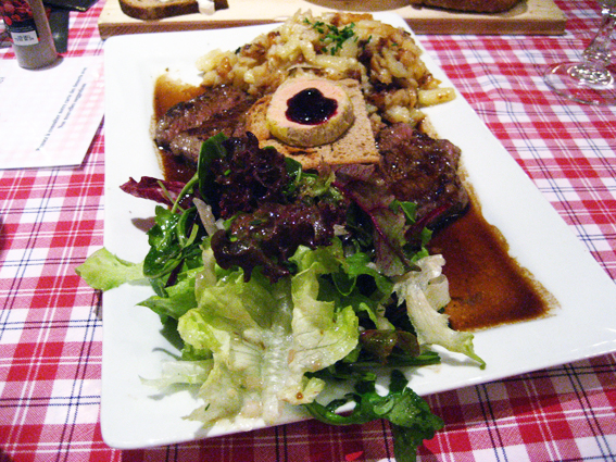 Δοκιμάσαμε μια πραγματικά υπέροχη μπριζόλα κόντρα με σάλτσα από κόκκινο κρασί και φουά γκρά και μια πιατέλα με ντόπιες λιχουδιές. Όπως μπορείτε να φανταστέιτε, το ελαφρύ φαγητό στην περιοχή αυτή είναι μάλλον δυσεύρετο…Όχι οτι μας πείραξε ιδιαίτερα, απλά το σημειώνω.