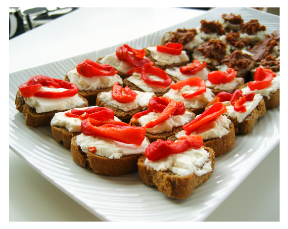 Mini rusks with two toppings: manouri cheese topped with roasted red peppers and soft xinomizithra cheese topped with olive and sun dried tomato tapenade