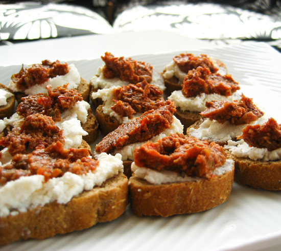 Mini rusks with goats cheese and an olive-sun dried tomato tapenade