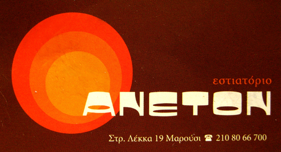 Για να πάρουμε όμως τα πράγματα από την αρχή, το Άνετον βρίσκεται στο Μαρούσι. Είναι μικρό και συμπαθητικό, με πολλά, όπως ανέφερα παραπάνω, στοχεία τις δεκαετίας του 60 στη διακόσμηση και δυο πανέμορφα πορτοκαλί φωτιστικά στην είσοδο. Η ατμόσφαιρα είναι γενικά χαλαρή, χωρίς να χάνει όμως την αίσθηση του εστιατορίου. Το προσωπικό είναι πολυάριθμο σε σχέση με τα τραπέζια, γεγονός που εξασφαλίζει τέλειο σέρβις.