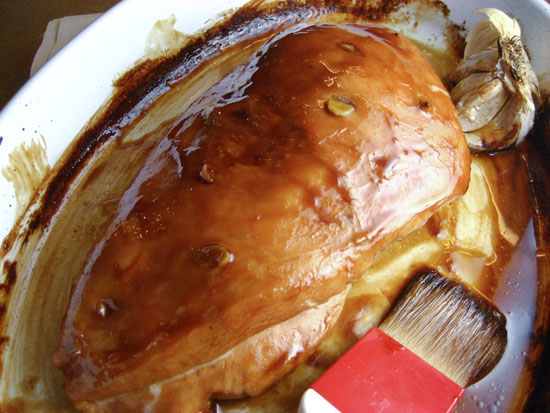 5. Bake for 40 minutes. Remove the breast from the oven, uncover, remove orange rind and brush with the honey and teriyake/soya sauce. Return to the oven for an extra 15 minutes, or until nicely browned and glazed. If you want to have the same glazed effect as the picture, make sure you baste the breast every 5 minutes with the pan juices, which will gradually thicken.
