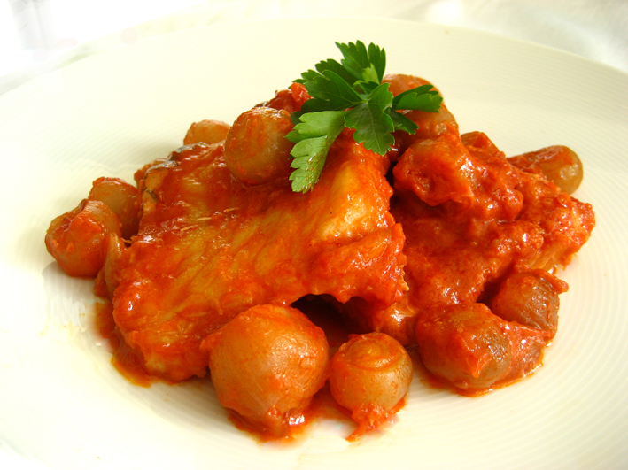 Salt cod Stifado (in red sauce with shallots)
