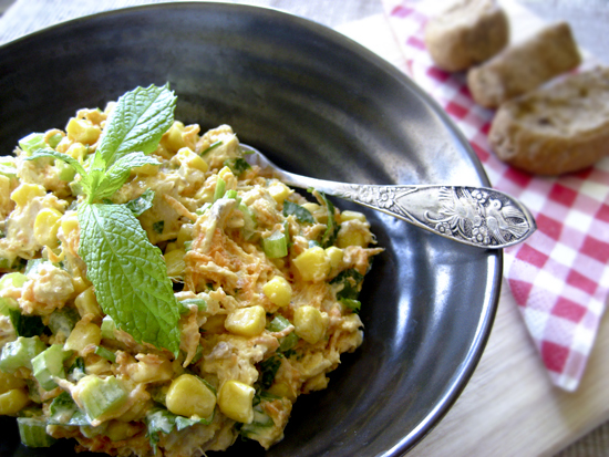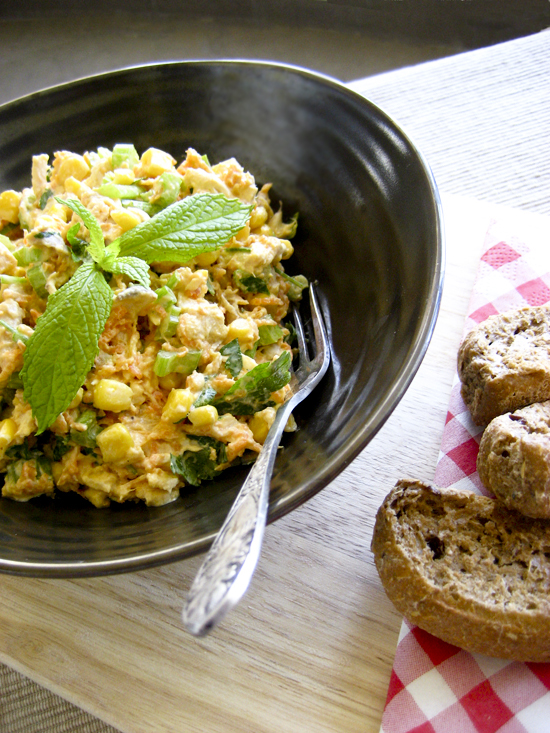 Η συνταγή για σαλάτα που σας δίνω είναι μάλλον επικίνδυνη, γιατί δεν θα μπορέσετα να σταματήσετε να την τρώτε. Το ξέρω γιατιί την έφτιαξα δύο φορές αυτήν την εβδομάδα. Πρόκειται για μια ζουμερή σαλάτα με κοτόπουλο, καλαμπόκι και λαχανικά, που φαίνεται αμαρτωλή αλλά δεν είναι, αφού το dressing της περιλαμβάνει λίγη μαγιονέζα και πολύ γιαούρτι.