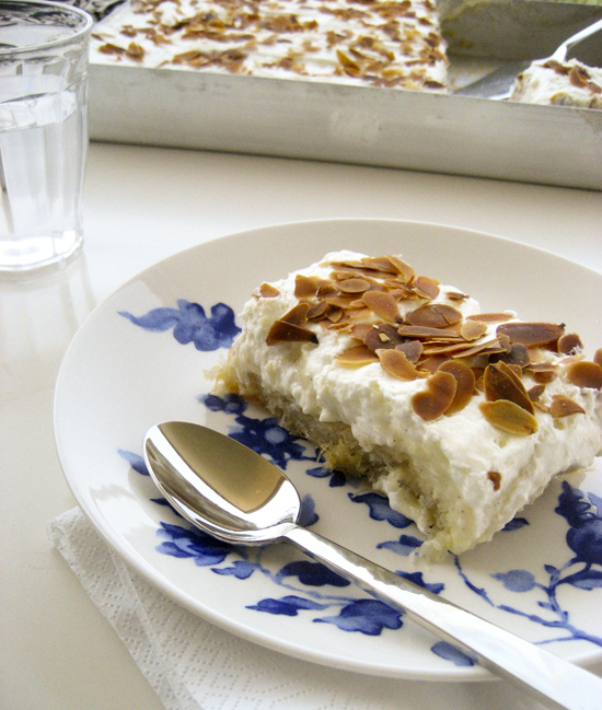 6. Make the whipped cream: in a clean bowl beat egg whites into a meringue. In another bowl, preferably chilled, beat chilled cream until it forms stiff peaks. Gently fold eringue into the whipped cream and spread over the cold cream. Leave the ekmek in the fridge overnight so that the tastes will bind.