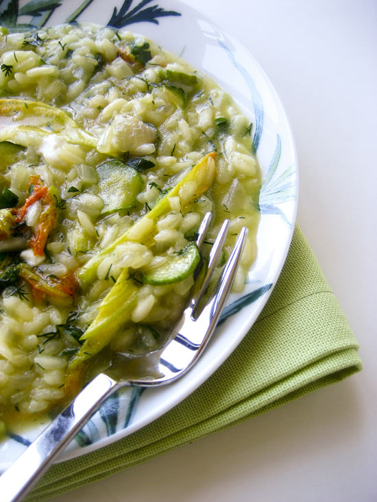 To make it lighter I used olive oil instead of butter, which I have found doesn’t compromise the taste at all. I also decided to add some dill together with the parsley as dill and courgettes are often found together in Greek cooking and finish the risotto with feta cheese instead of parmigiano. The final touch of elegance was given by Greek saffron from Kozani, that not only tinted the risotto a lovely golden colour, it also imparted that je ne sais quoi to the flavour.