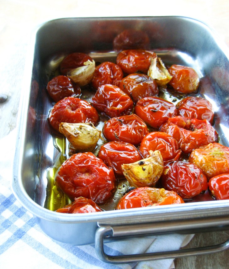 - Wash the tomatoes well and cut in half. Place them cut side down on a baking tray an drizzle with olive oil. Scatter the cloves of garlic all over the tray and roast for about 30 minutes.