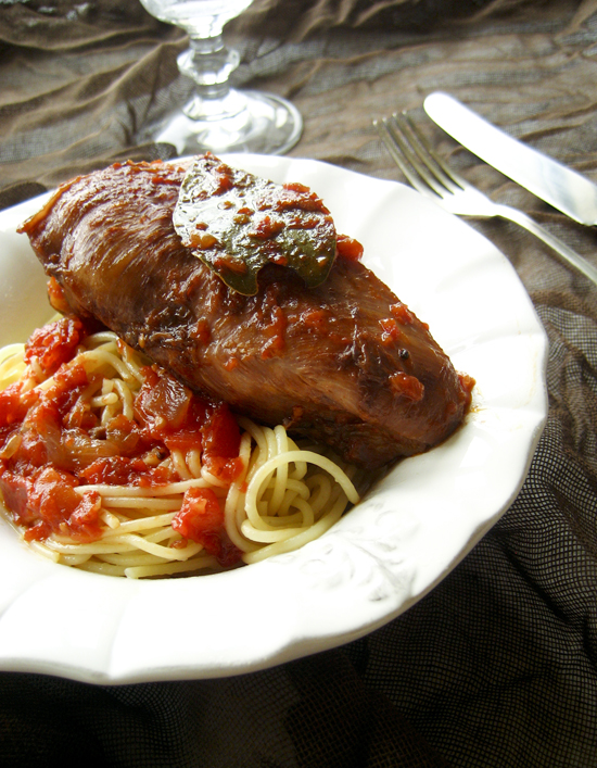 - Add the chopped onions and let them soften. Pour in the wine, wait until it has evaporated a bit and then add the tomatoes, garlic and spices and simmer everything very gently until the sauce is thick and the meat is tender and falling off the bone, about 1 hour.