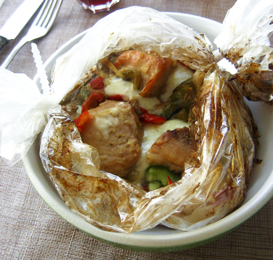 A few years ago, while visiting Drama, one of the large towns of Northern Greece, I tried a very tasty dish called «gioulbasi». It is basically three different kinds of meat, wrapped in baking parchment together with peppers and cheese and slowly baked in the oven. The name is obviously of Turkish origin, but the dish I think is more Balkan at heart.