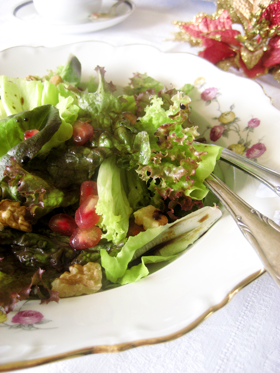 Green salad with walnuts, pomegranates and petimezi dressing/ Πράσινη σαλάτα με καρύδια, ρόδι και σάλτσα πετιμεζιού