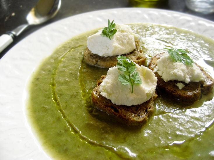 4. Serve the soup with a good drizzle of extra virgin olive oil and the toasted bread with goats cheese (or feta).