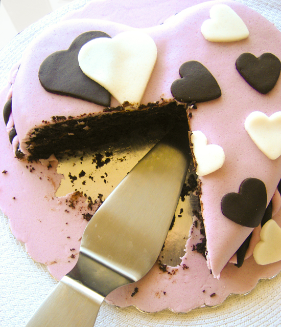 Τώρα βέβαια θα μου πείτε γιατί μπήκα στον κόπο να φτιάξω ολόκληρο κέικ με ζαχαρόπαστα σε σχήμα καρδιάς αν δεν πιστεύω σε όλα αυτά; Καταχάς γιατί το έκανα τρελό κέφι. Κατά δεύτερον γιατί πιστεύω πως αν τελικά γιορτάσει κανείς θα είναι όμορφο να φτιάξει κάτι καλαίσθητο και σπιτικό να δώσει στο έτερον ήμισυ. Κάτι που να ξεφεύγει λίγο από το χυδαίο αισθητικά ρεπερτόριο της ημέρας.  Και νομίζω πως το πέτυχα, γιατί το κέικ βγήκε αρκετά chic και διακριτικό και ταριάζει σε πολλές περιστάσεις.