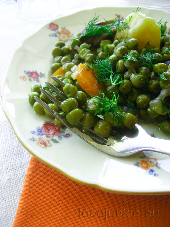 Peas are in season now and one of my absolute favourite vegetables, but until now I would only cook them in two ways: with some spring onions and dill and with artichokes. However, fate had other plans for my cooking repertoire. I was walking down the isle with all the frozen goods looking for some phyllo dough, when I spotted in the frozen vegetable section a  bag containing ready-to-cook meal I had never heard before: peas with aubergines. I actually had all the ingredients at home, so I decided to give it a try as soon as I got back from the supermarket.