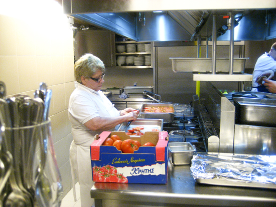 Το τελευταίο μας δείπνο στο φεστιβάλ είχε γεύση σαφώς πιο παραδοσιακή. Μπορεί φέτος η νέα Ελληνική κουζίνα να ήταν το γενικό concept, αλλά η κα. Σύρου αντιπροσωπεύει την μαγειρική των μαμάδων (και γιαγιάδων) μας με τον καλύτερο τρόπο. «Μου αρέσει να το παιδέυω το φαγητό» μου είπε όταν πήγα να την βρω στην κουζίνα της, λίγες ώρες πριν το δείπνο, εννοόντας πως δεν αγαπά τις εύκολες και γρήγορες λύσεις. Μετά μου έδωσε να δοκιμάσω τα καλούδια που μόλις είχε ετοιμάσει: ρολάκια μελιτζάνας με φέτα και «σόζε» (σάλτσα), μπάμιες, μοσχαράκι στιφάδο. Τυχεροί είναι οι Γερμανοί να την έχουν να τους μαγειρεύει…