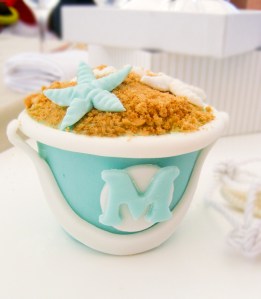 My friend knew that I love baking and decorating with sugarpaste (fondant) so she asked me whether I could make a two tier small birthday cake (her son turned one a few days before the christening), 100 mini cupcakes and 150 individual cakes shaped as beach pails. The cupcakes were chocolate, the mini cakes lemon-coconut, with a white chocolate and cream cheese filling, and the cake was orange-bitter almond filled with chocolate ganache.