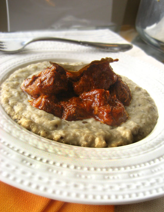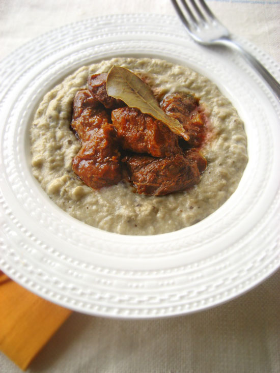 8. To serve: place two-3 tbsp of aubergine puree on each plate, make a small well in the centre and add some meat with sauce. Serve hot.