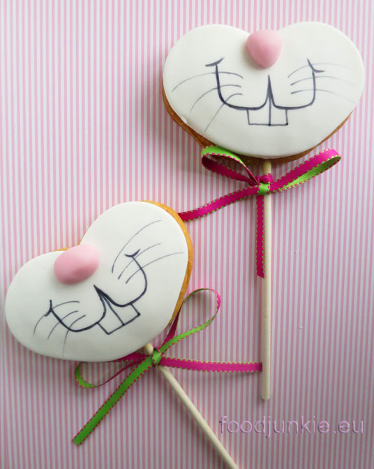 9. Παίρνουμε λίγη λευκή ζαχαρόπαστα και τη βάφουμε ροζ, ρίχνοντας ελάχιστο χρώμα ζαχαροπλαστικής κόκκινο. Τη ζαχαρόπαστα συνήθως τη βάφουμε με χρώματα σε μορφή πάστας και όχι υγρά, γιατί τα υγρά χρώματα «λασπώνουν» τη ζαχαρόπαστα. Επειδή όμως η ποσότητα αυτή είναι πολύ μικρή και τα υγρά χρώματα τα βρίσκετε και στα σουπερμάρκετ, μπορείτε να βάλετε και υγρό χρώμα. Με τη ροζ ζαχαρόπαστα φτιάχνουμε τις μυτούλες σε οβάλ ή ελαφρώς τριγωνικό σχήμα και τις κολλάμε εκεί που ενώνονται τα δύο ημικύκλια της καρδιάς με λίγο νεράκι ή την «κόλλα» που φτιάξαμε. Ζωγραφίζουμε με το μαρκαδόρο τα υπόλοιπα στοιχεία (μάγουλα, μουστάκια, δόντια) και είμαστε έτοιμοι! Αφήνουμε τα μπισκοτάκια να στεγνώσουν πριν τα συσκευάσουμε σε σακκουλάκια.