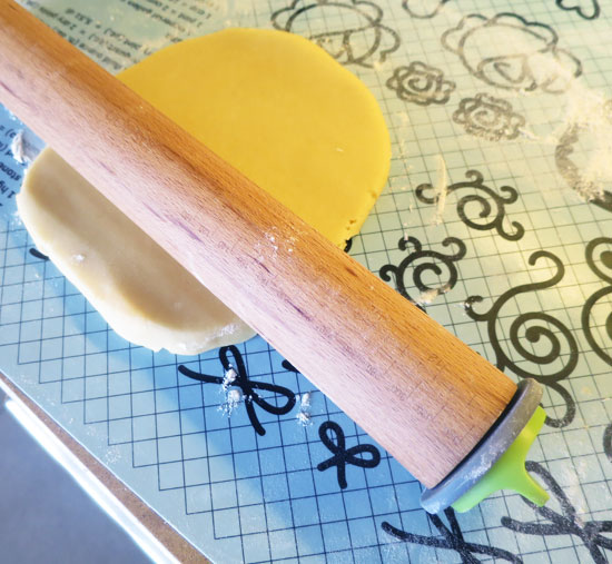 2. Με έναν πλάστη ανοίγουμε τη ζύμη σε πάχος περίπου 0,6εκ. Όπως βλέπετε εγώ έχω ένα ειδικό πλάστη που στις άκρες του μπαίνουν οδηγοί και δίνει έτσι πάντα το ίδιο πάχος. Καλύτερα δουλεύουμε λίγη λίγη τη ζύμη ώστε να παραμένει κρύα.