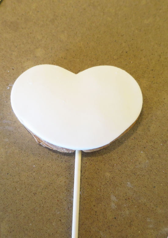 8. Αλείφουμε το κάθε μπισκότο με λίγη από την «κόλλα» με τη βοήθεια ενός πινέλου και κολλάμε επάνω τις στρογγυλεμένες καρδιές. Αφήνουμε τη ζαχαρόπαστα να στεγνώσει καλά πριν τη ζωγραφίσουμε.
