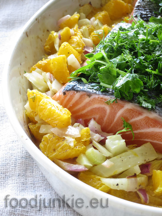 Σολομος φιλέτο ολόκληρο με πορτοκάλι και μαραθόριζα (φινόκιο)