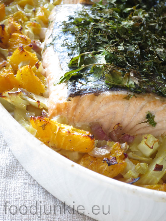 Αυτό το πανεύκολο πιάτο νομίζω θα γίνει ο καλύτερός σας φίλος αν έχετε να τραπεζώσετε ανθρώπους που ξέρουν να τρώνε ή θέλετε να απολαύσετε ένα γκουρμέ, υγιεινό, εύκολο γεύμα. Έχει ελάχιστη προετοιμασία, γίνεται μέσα σε 1 ώρα και η γευστική του φινέτσα δεν προδίδει την ευκολία του! Προσωπικά δεν είχα ξαναφάει ψημένο πορτοκάλι ποτέ σε τόση ποσότητα, ειδικά με σολομό (έμαθα μετά πως είναι κλασικός συνδυασμός) και αυτό που μου άρεσε είναι πως το πορτοκάλι κόβει όλη τη λιπαρότητα του ψαριού.