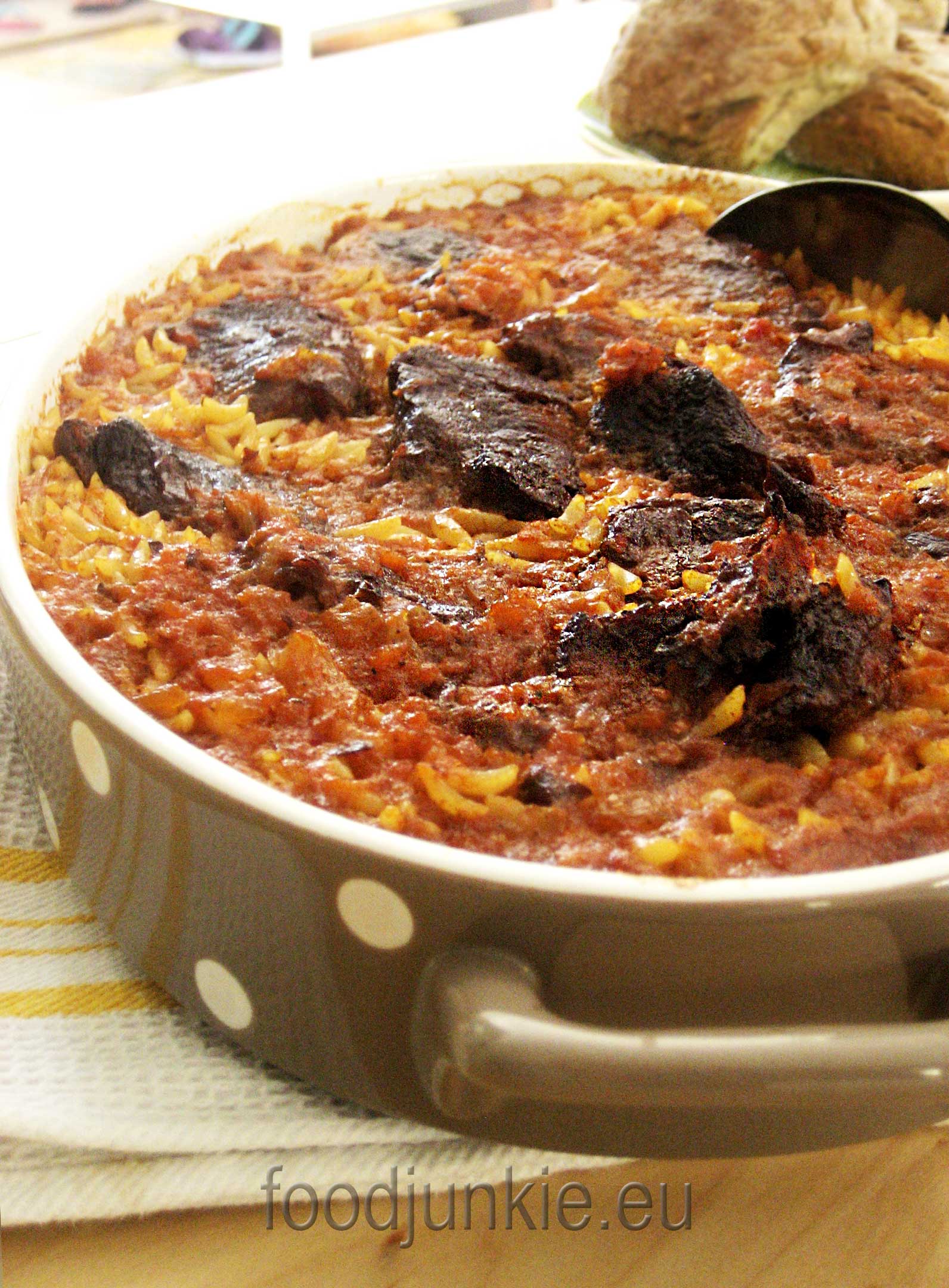 7. Βάλτε το φαγητό στο φούρνο και ψήστε το για περίπου 20 λεπτά. Κοιτάξτε να δείτε πως πάει, αν έχει βράσει το κριθαράκι και αν χρειαζεται κι άλλα υγρά. Εμένα πήρε 25 λεπτά και μόλις βγήκε έριξα άλλες 2 κουταλιές σάλτσα με την κουτάλα της σούπας και το άφησα να «μαρουβίσει», να πιεί δηλαδή τα υγρά του και να μελώσουν οι γεύσεις.