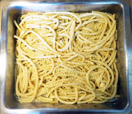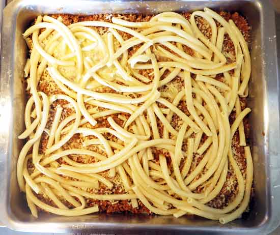 - Απλώστε τα υπόλοιπα μακαρόνια από πάνω, μαζί με ότι γάλα έχει μείνει στην κατσαρόλα, αλατίστε και ρίξτε άλλο λίγο τυρί. Αφήστε λίγο τυρί και για τη μπεσαμέλ.