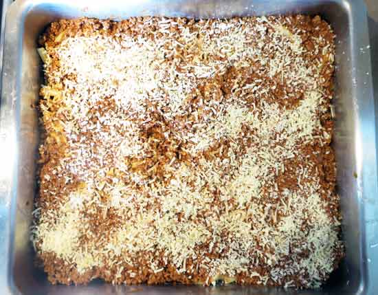 - Απλώστε από πάνω τον κιμά προσεκτικά με ένα κουτάλι ώστε να καλύπτει την επιφάνεια των μακαρονιών. Ρίξτε από πάνω άλλη μια χούφτα τυρί.