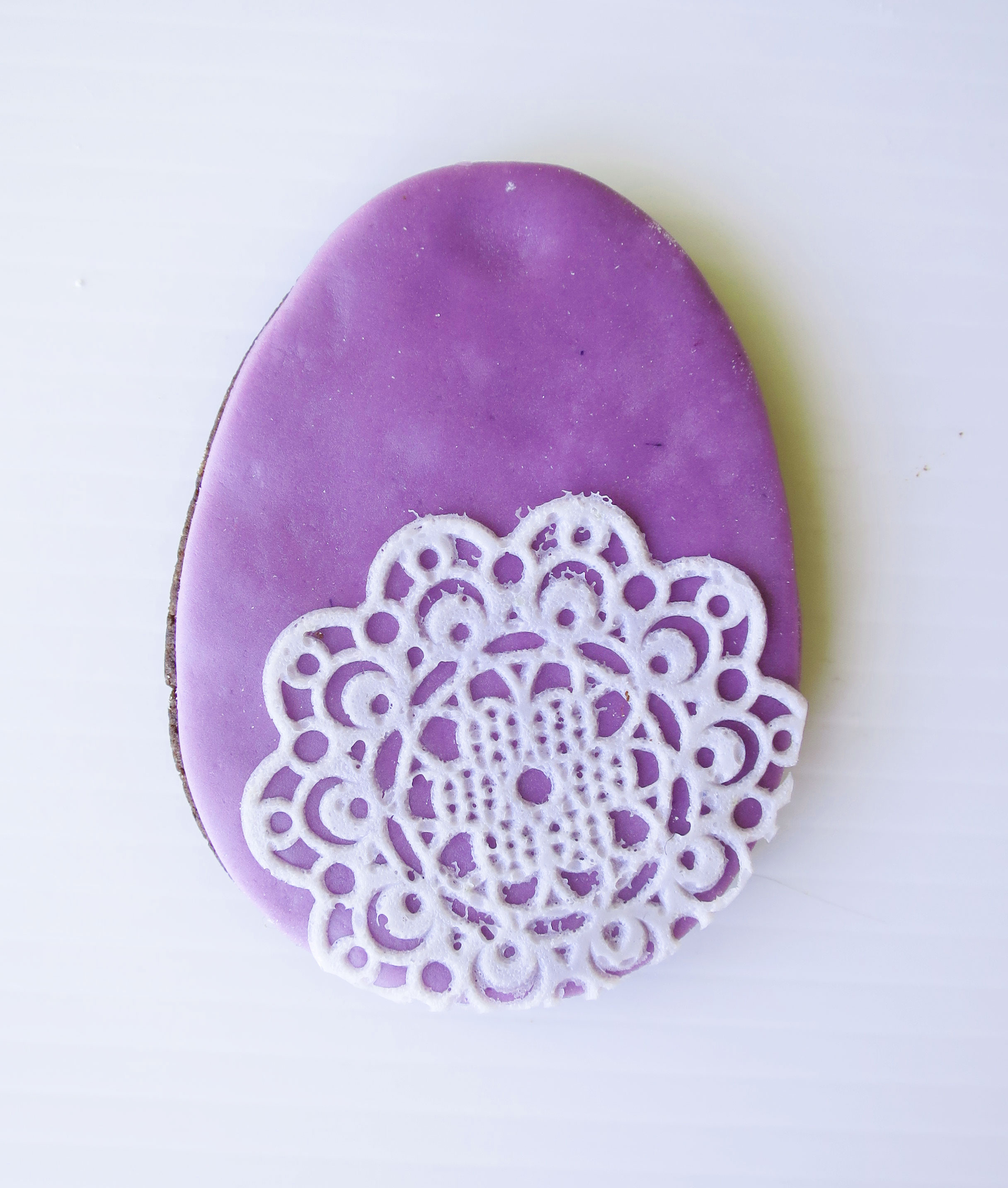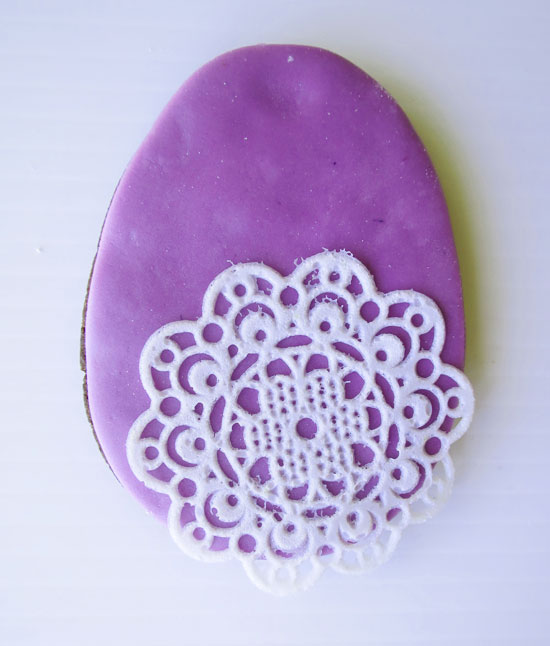 8. Ακουμπήστε τη δαντελίτσα στην ζαχαρόπαστα αφήνοντας να περισσεύει ένα μέρος της. Επειδή η ζαχαρόπαστα είναι λίγο νωπή ακόμη θα κολλήσουν μεταξύ τους. Αν δεν κολλάνε βάλτε ελάχιστο νεράκι στη δαντελίτσα.