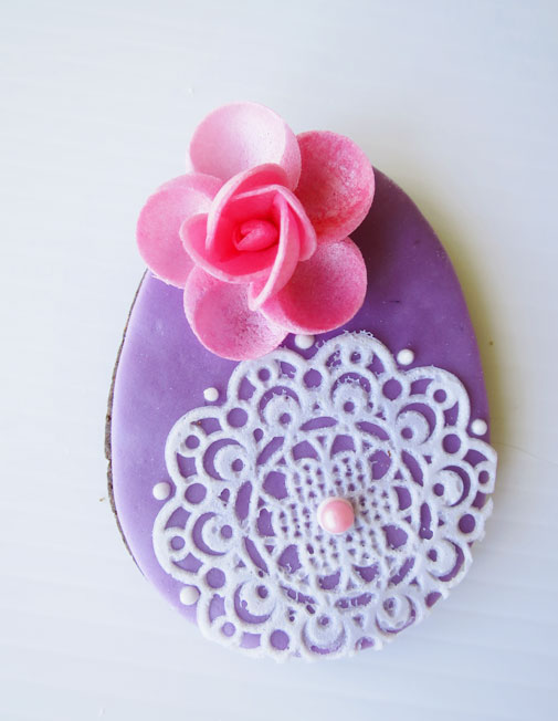 11. Γεμίστε το κορνέ με το γλάσο αβγού και βάλτε λίγο στην επάνω αριστερά πλευρά του μπισκότου. Κολλήστε εκεί το λουλουδάκι.
