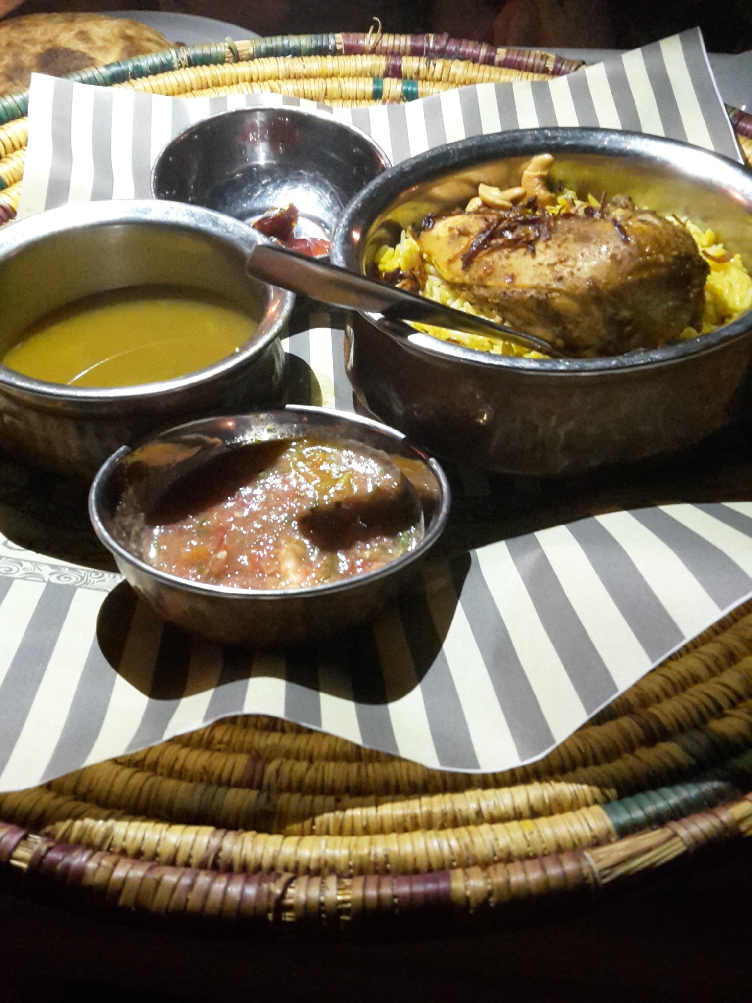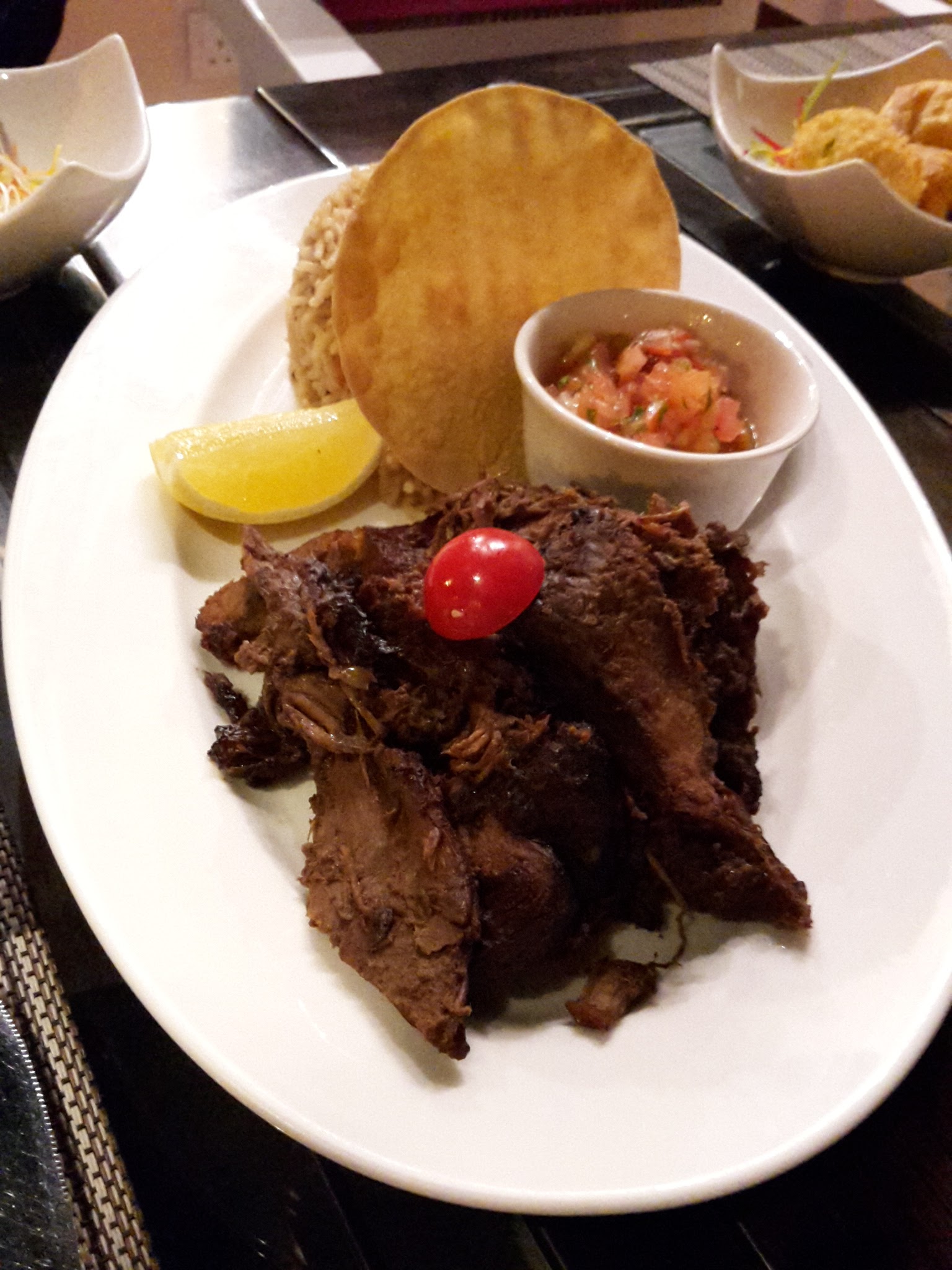 ακριβως κάτω από το σπίτι μας, ότι έπρεπε δηλαδή μετά από μια κουραστική ημέρα! Εκεί ξεκινήσαμε με μια πιατέλα από αραβικά-λιβανέζικα μεζεδάκια (χούμους, μουταμπάλ κλπ) όλα εξαιρετικά. Στη συνέχεια μοιραστήκαμε ένα kabuli shuwa, το αγαπημένο πιάτο του Ομάν. δηλαδή μαριναρισμένο κρέας (στην περίπτωσή μας μοσχάρι) αργομαγειρεμένο σε φύλλα μπανάνας για πολλές ώρες και σερβιρισμένο με ρύζι. Αν και το κρέας δεν είχε σάλτσα, ήταν τόσο μαλακό και νόστιμο που μακάρι να το ξανάτρωγα!