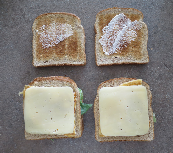 - Αλείψτε όλες τις φέτες με λίγη μαγιονέζα και μουστάρδα