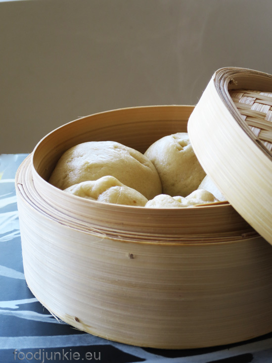 - Όταν τα ψωμάκια είναι έτοιμα, προετοιμάστε τον ατμομάγειρα μπαμπού ή όποιο άλλο εξάρτημα ή σκεύος έχετε για μαγείρεμα στον ατμό. Το μυστικό είναι να μην ακουμπάει στο νερό και να μπορεί να κλείσει από πάνω. Σε μια κατσαρόλα βάλτε νερό να βράσει και ακουμπήστε πάνω τον ατμομάγειρα μπαμπού. Τοποθετήστε τα ψωμάκια μέσα έτσι ώστε να είναι περίπου 2 εκ. απόσταση μεταξύ τους και 2 εκ. απόσταση από την άκρη του μπαμπου. Θα χρειαστεί να τα ψήσετε σε 2 ή τρεις δόσεις. Κλείστε το καπάκι και ψήστε τα για 15 λεπτά περίπου.