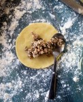 - Γεμίστε κάθε στρογγυλό κομμάτι ζύμης με μια κουταλίτσα γέμιση και αλείψτε την άκρη με ασπράδι αβγού. Διπλώστε τη ζύμη πάνω από τη γέμιση δημιουργώντας μισοφέγγαρα. Κλείστε το πιτάκι γύρω γύρω πιέζοντας με τα δάκτυλά σας. Βάλτε τα πιτάκια να παγώσουν στο ψυγείο για 20 λεπτά.