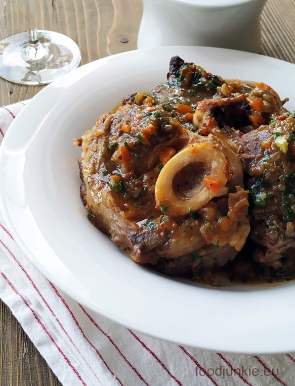 Μιας και ιταλίδα δεν είμαι, η συνταγή μου βασίστηκε εδώ κι εδώ. Το βασικό για τη συνταγή είναι, φυσικά, το κρέας. Αφού μαγειρεύεται με το κόκκαλο (και το μεδούλι του τρώγεται), πρέπει να είναι από καλό κρέας, κατά προτίμηση αγορασμένο από χασάπη που ξέρετε και εμπιστεύεστε και όχι από το σούπερ μάρκετ. Επειδή είναι κομμάτι που χρειάζεται πολύ χρόνο για να μαλακώσει, καλό θα είναι να σιγομαγειρευτεί