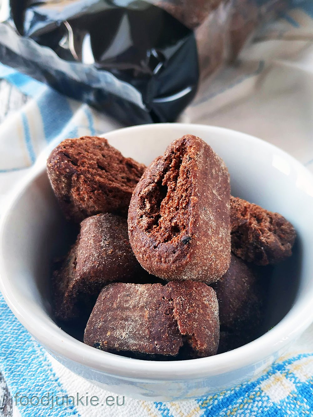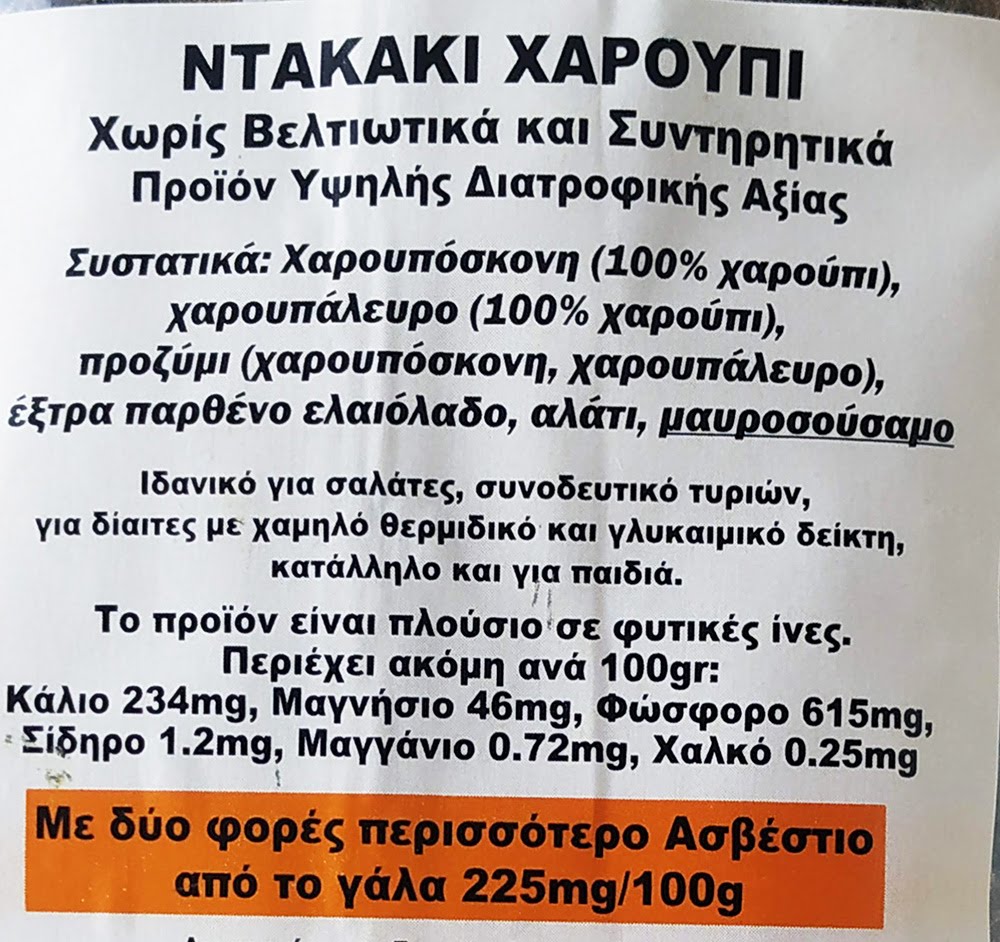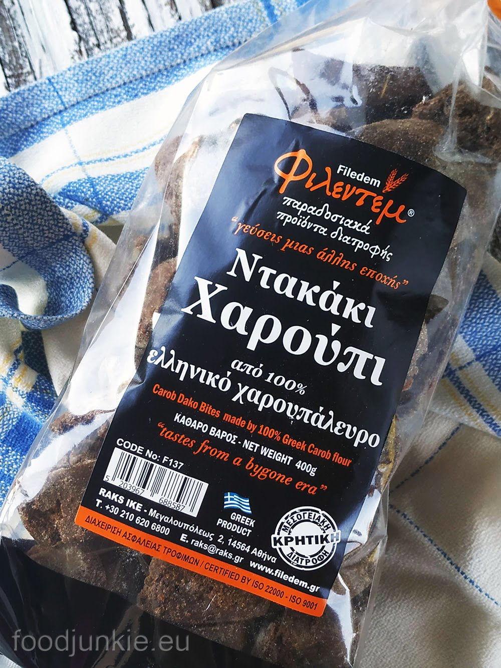 Από τα προϊόντα τους αγαπώ πολύ τη μουστάρδα (χωρίς χρωστικές, με λίγη μαύρη ζάχαρη), το φιστικοβούτυρο (από 100% Σερραϊκό φιστίκι, χωρίς φοινικέλαιο!), την σάλτσα ντομάτας (με λίγο κρεμμύδι, λίγο μαϊντανό και υπέροχη γεύση!) και φυσικά τα ντακάκια χαρουπιού, τα μόνα, αν δεν κάνω λάθος, στην ελληνική αγορά που είναι από 100% χαρούπι, χωρίς κανένα ίχνος σιτηρών! Μάλιστα, καλά διαβάσατε. Και εφόσον τα σιτηρά προσωπικά με πειράζουν και τα αποφεύγω, καταλαβαίνετε γιατί αγαπάω τόσο τα ντακάκια αυτά. Βγαίνουν σε δύο μορφές, με ή χωρίς αλάτι και έχουν μια γεμάτη, αρωματική γεύση, με ελάχιστη γλύκα (το χαρούπι είναι εκ φύσεως λίγο γλυκό, αλλά τα παξιμάδια είναι για αλμυρές παρασκευές). Είναι μικρά, ώστε να μπορεί κανείς να ελέγξει τη μερίδα του, και αφράτα, ώστε να μην χρειάζονται βρέξιμο. Το μόνο αρνητικό είναι πως δεν έχουν ένδειξη «χωρίς γλουτένη» και έτσι δεν μπορούν να χρησιμοποιηθούν από ανθρώπους που πάσχουν από κοιλιοκάκη, ενώ θεωρητικά το χαρούπι είναι προϊόν που δεν έχει γλουτένη!