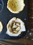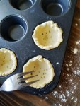 - Παρτε κάθε στρογγυλό κομμάτι ζύμης και απλώστε το σε όλη την επιφάνεια της κάθε θήκης. Με ένα πιρούνι τρυπήστε το κάτω μέρος του ζυμαριού.