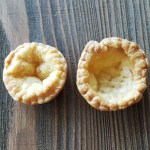 - Ψήστε πρώτα τα ταρτάκια καλυμένα για 10-12 λεπτά. Βγάλτε τις λαδόκολλες και τα φασόλια/φακες και συνεχίστε το ψήσιμο για άλλα 10 λεπτά. Μόλις ψηθούν, αφήστε τις βάσεις να κρυώσουν για 10 λεπτά και στην συνέχεια ξεφορμάρετέ τις. Μπορείτε να φτιάξετε τις βάσεις μέχρι και τρεις ημέρες πριν τις χρησιμοποιήσετε και να τις φυλάξετε σε δοχείο που κλείνει καλά. Υπάρχει λόγος που μπαίνουμε στην διαδικασία με τα φασόλια. Αν παρατηρήσετε τη φωτογραφία παραπάνω, το δεξιά ταρτάκι ψήθηκε με φασόλια και διατήρησε την κοιλότητά του, ενώ το αριστερά ψήθηκε μόνο του και συρρικνώθηκε!