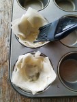 - Κόψτε το φύλλο σε τετράγωνα περίπου 9×9 εκατοστά. Λαδώστε τις εσοχές για τα cupcakes στο ταψακι και βάλτε 4 φύλλα σε κάθε εσοχή, λαδώνοντας το καθέ ένα. Γεμίστε με την γέμιση (περ 2 κ.σ. σε κάθε ταρτάκι). Θα χρειαστείτε και ένα δεύτερο ταψάκι, ή να ψήσετε δύο φορές, γιατό η συνταγή βγάζει περίπου 15-17 κομμάτια.