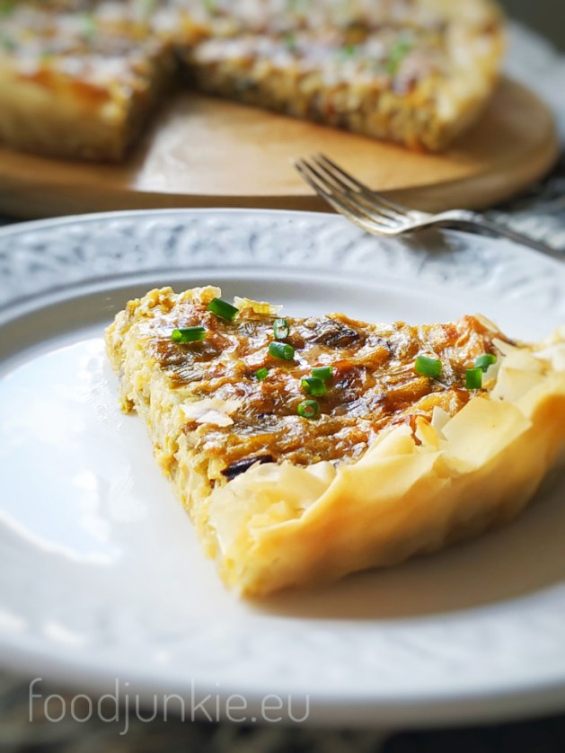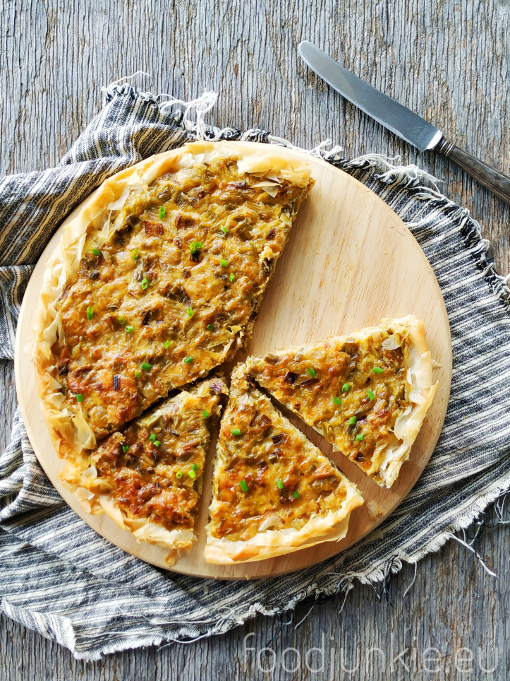 Όπως βλέπετε, αυτή τη φορά δεν έχω χρησιμοποιήσει ζύμη τάρτας (αν και θα της πηγαινε πολύ), αλλά φύλλο κρούστας. Αυτό δίνει ένα πιο ελαφρή αποτέλεσμα στη γεύση, μιας και το πράσο είναι ένα λίγο βαρύ υλικό. Αν όμως θέλετε, μπορείτε να τη φτιάξετε και με ζύμη τάρτας ή με ψωμένια ζύμη. Θα γίνει νόστιμη και με τις δύο εκδοχές.