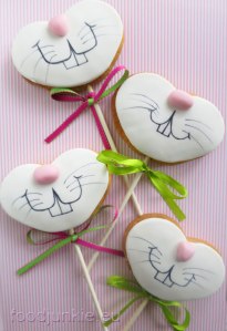 Για το τέλος, σας έχω τρία μικρα project για διακοσμημένα γλυκάκια. Το πρώτο είναι γλυκούλια μπισκότα κουνελάκια που στέκονται πάνω σε καλαμάκια. Η δεύτερη είναι μπισκότα-αβγά με στοιχεία βρώσιμης δαντέλας. Επειδή φαντάζομαι θα είναι