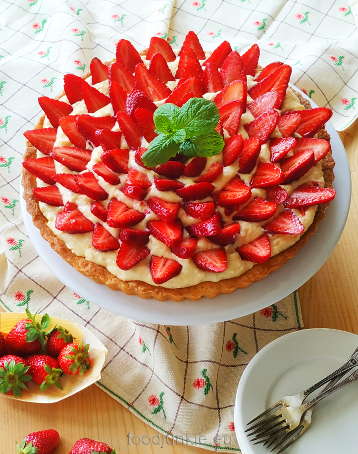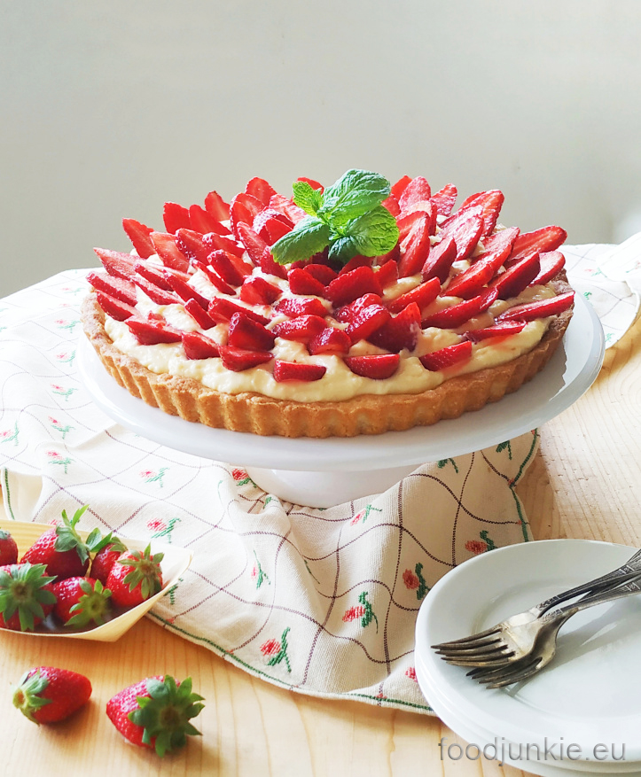 Με την εορταστική αυτή διάθεση μια τάρτα φράουλα ταιριάζει απόλυτα νομίζω, αφού οι φράουλες πια έχουν βγει και είναι λαχταριστές. Δεν ξέρω, αλλά αυτή η κλασική τάρτα είναι από τους ωραιότερους τρόπους να απολαύσουμε το νόστιμο αυτό φρούτο. Η τραγανή βάση μαζί με την βελούδινη κρέμα και την οξύτητα από τις φράουλες κάνουν έναν ακαταμάχητο συνδυασμό. Το βουτυράκι από τη βάση βοηθάει επίσης πολύ, οπότε μην πάτε και μου βάλετε καμιά έτοιμη βάση γεμάτη μαργαρίνες και μου το χαλάσετε!