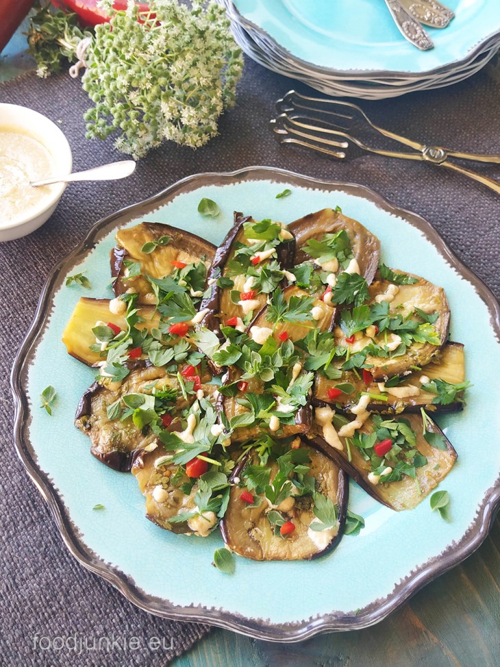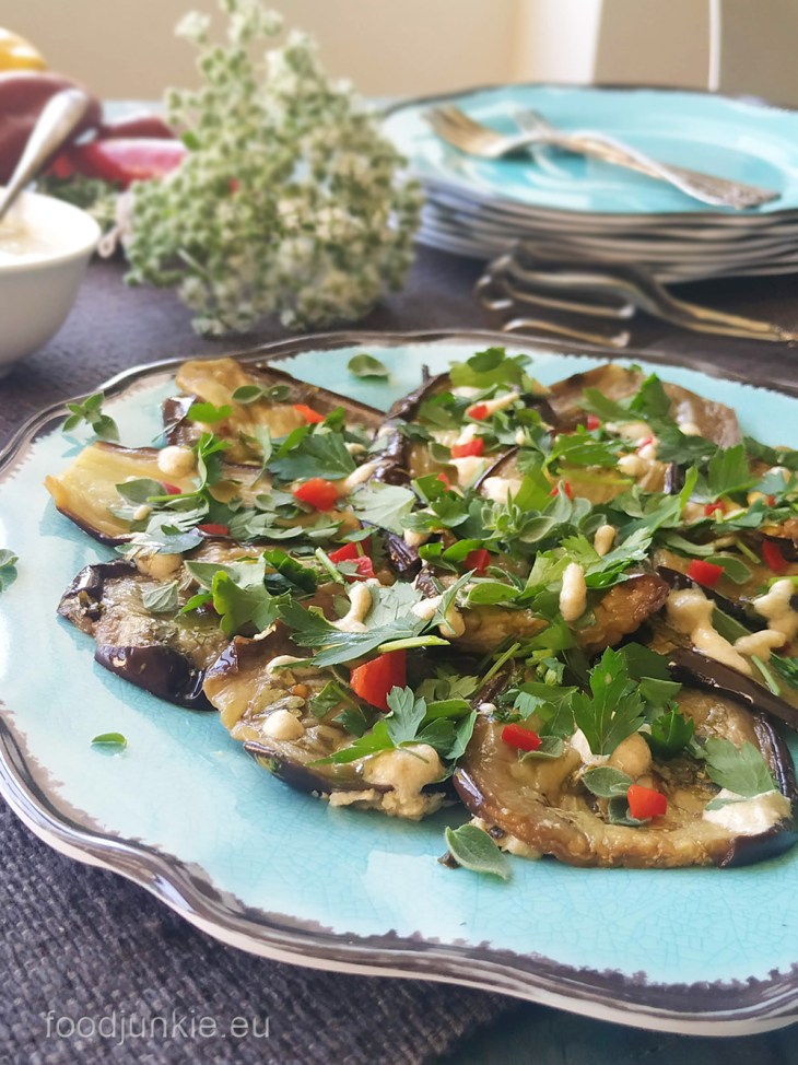 Μαριναρισμένες ψητές μελιτζάνες μα σάλτσα ταχίνι