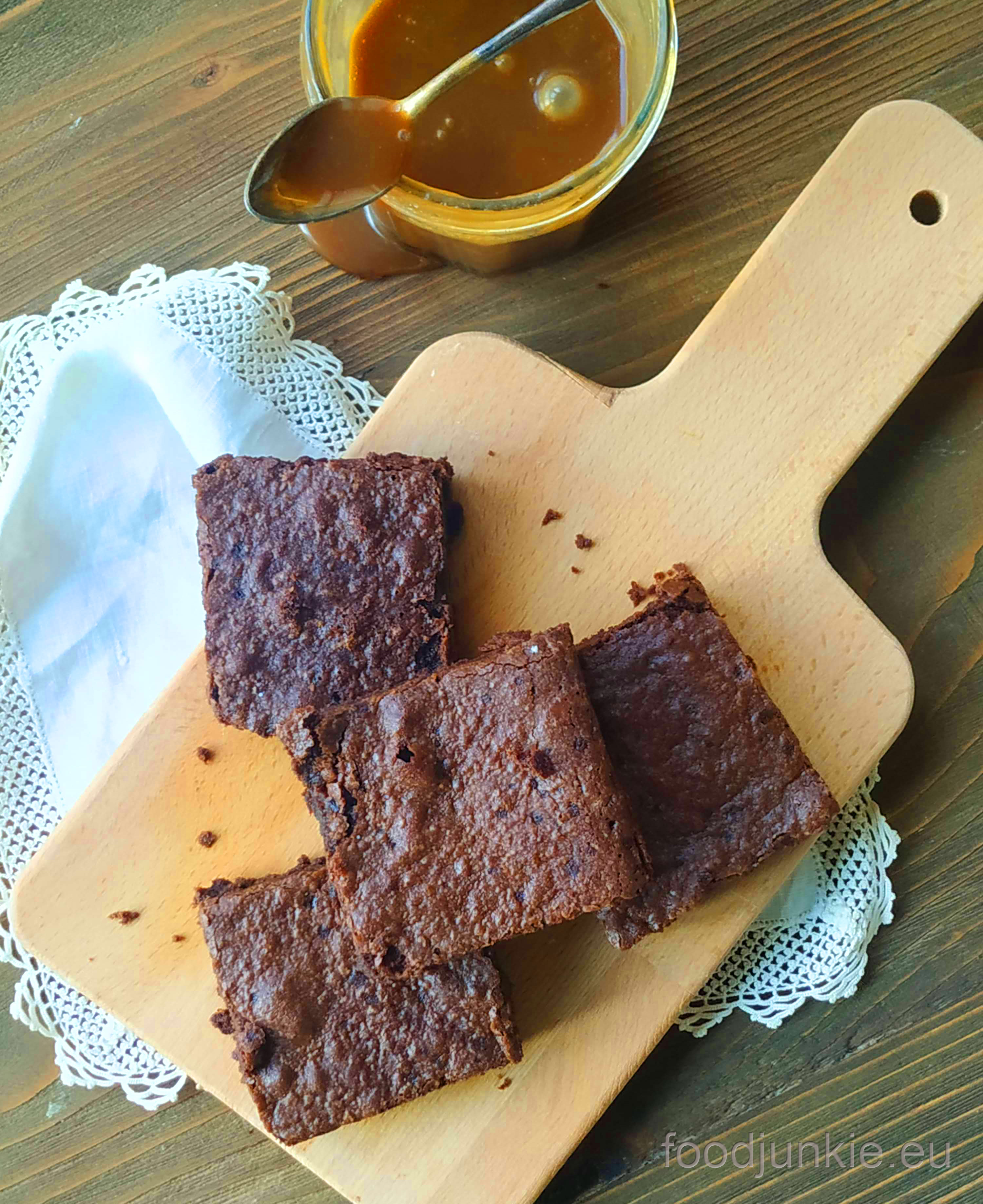 Τώρα, η σάλτσα καραμέλας δεν είναι πραγματικά απαραίτητη για την απόλαυση αυτών των brownies, ούτε βέβαια το παγωτό. Όμως ο συνδυασμός αρέσει πολύ και με τον τρόπο αυτό γινονται πραγματικό επιδόρπιο. Για την καραμέλα θα σας δώσω δύο συνταγές. Η μία υπάρχει ήδη στο μπλογκ, αλλά χρειάζεται golden syrup, που δεν το βρίσκει κανείς εύκολα, ειδικά σε μικρά σουπερμάρκετ στα νησιά. Η δεύτερη χρειάζεται μόνο 4 υλικά (ζάχαρη, νερό, βούτυρο και κρέμα γάλακτος και αλάτι, αν θέλετε να την κάνετε αλμυρή) που τα βρίσκει κανείς παντού. Απλά θέλει λίγο προσοχή γιατί η καραμέλα καίει!
